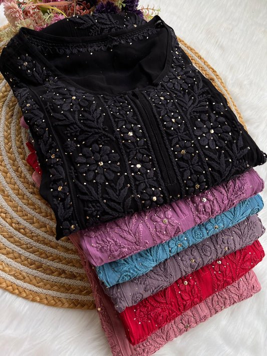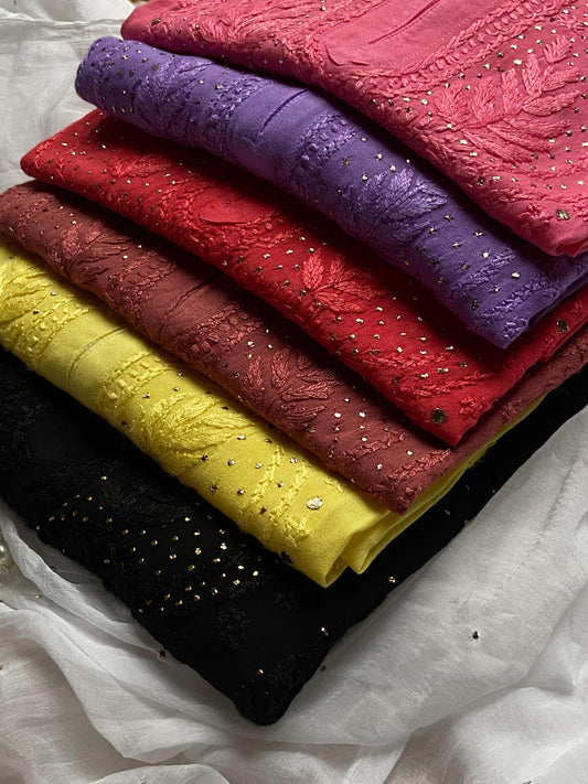 Explore the timeless artistry of Chikankari, a revered embroidery technique originating from Lucknow, India. With delicate threadwork adorning fine fabrics, Chikankari embodies elegance and tradition. Discover the intricate beauty of Chikankari Embroidery, meticulously handcrafted by skilled artisans. From graceful Chikankari Dresses and Kurtis to opulent Sarees and Lehengas, each garment tells a story of heritage and craftsmanship. Elevate your wardrobe with Chikankari Suits and Tops, perfect for both formal affairs and everyday wear. Immerse yourself in the allure of Chikankari Fabrics, from airy cotton to luxurious georgette, offering versatility and sophistication. Experience the timeless charm of Chikankari and indulge in its exquisite craftsmanship.