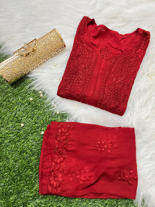 Red Beautiful 3D Viscose Lucknow Chikankari Work Kurti and Pallazo
