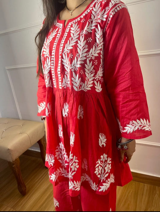Red Chikankari Cotton Short Kurti Palazzo Set