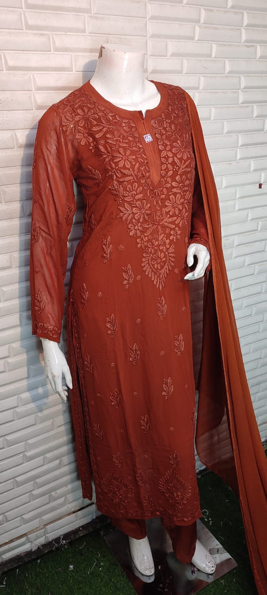 Brick Red Festive Collection: Lucknow Chikankari Pure Viscose 3D Kurti & 3-Piece Set