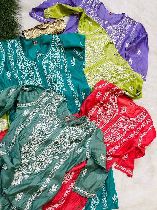 Red Chanderi Silk Lucknow Chikankari Kurti Set