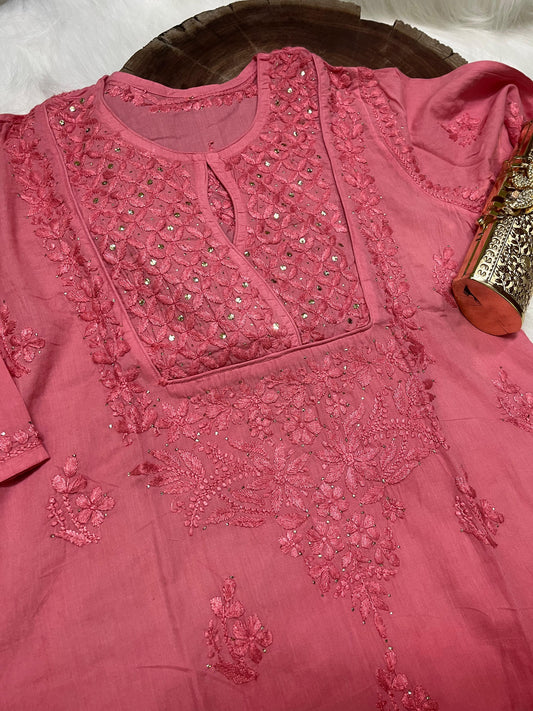 Brick Red Ethereal Elegance: Lucknow Chikankari Heavy Modal Big Size Kurti