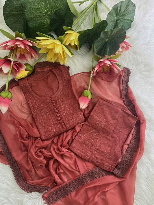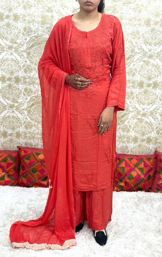 Brick Red Lucknowi Chikankari Rayon Kurti and Palazzo Set with Chiffon Dupatta