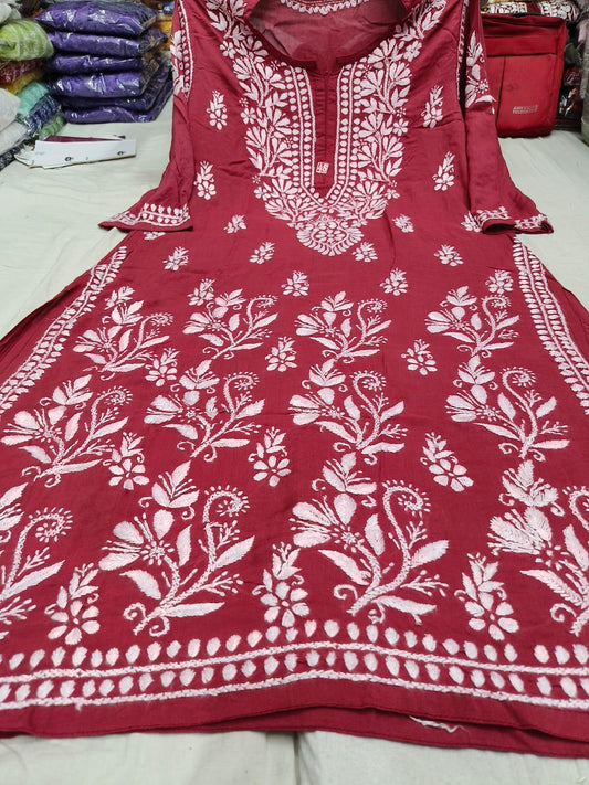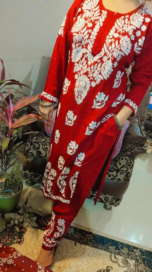 Red Exquisite Lucknowi Chikankari Modal Kurti with White Rayon Palazzo