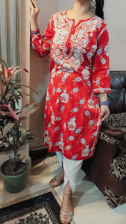 Red Elegant Lucknowi Chikankari Cotton Kurti & Pant Set