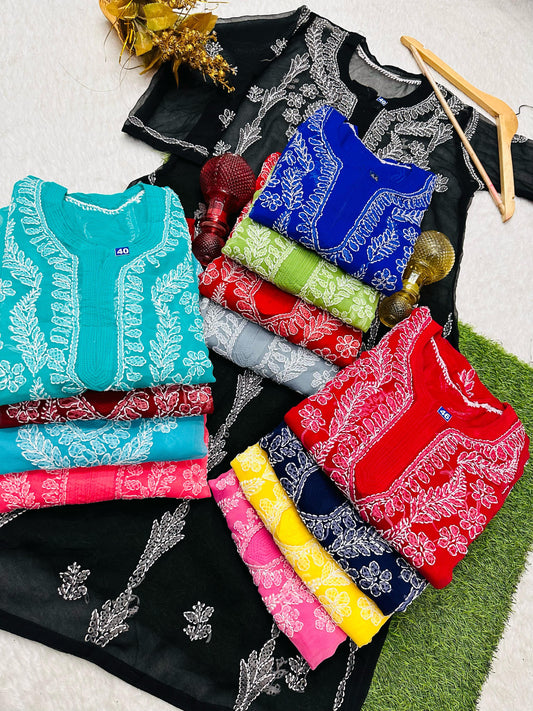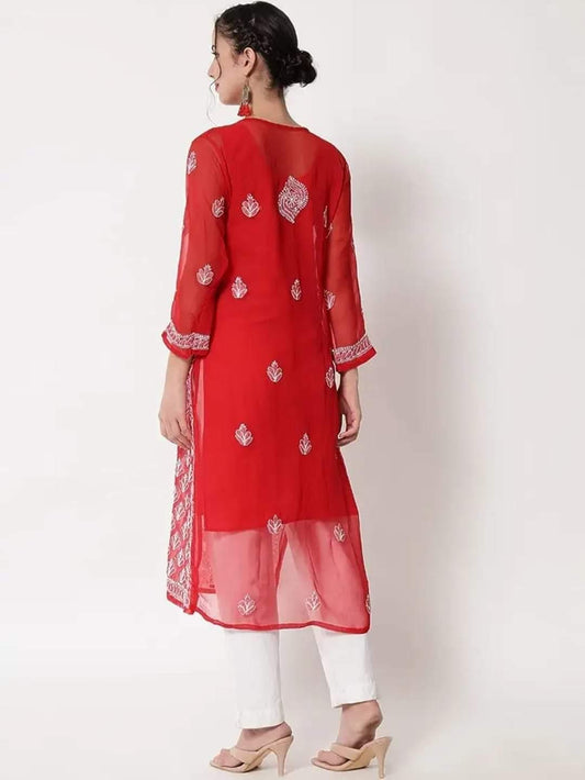 Red Enchanting Gala: Lucknawi Georgette Chikankari Booti Kurti Set