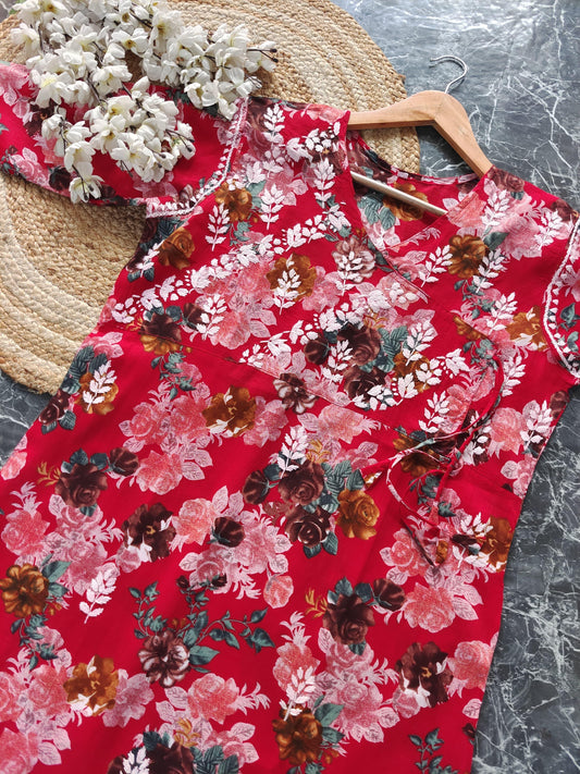 Red Elegant Viscose Daman Designer 3D Chikankari Long Kurti