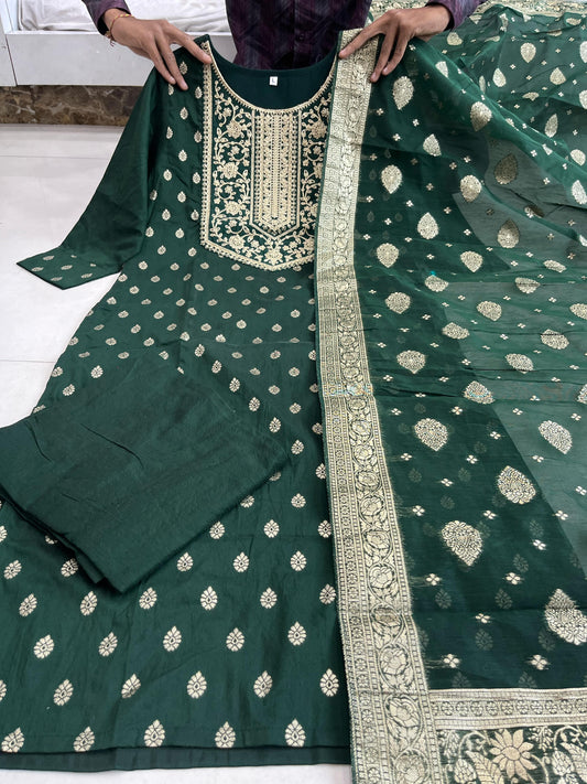 Green Artisan Jacquard Suit Set: Embroidered Neck Top, Pants & Zari Weaving Dupatta