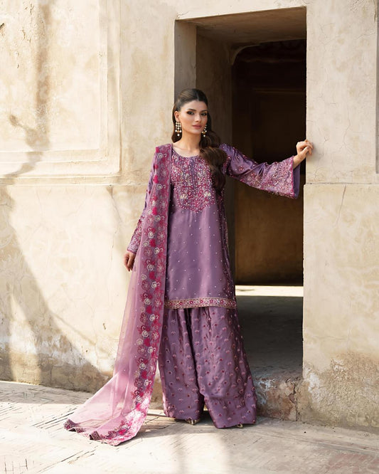 Purple Embroidered Chinnon Silk Top & Sharara Set with Dupatta – Ready to Wear