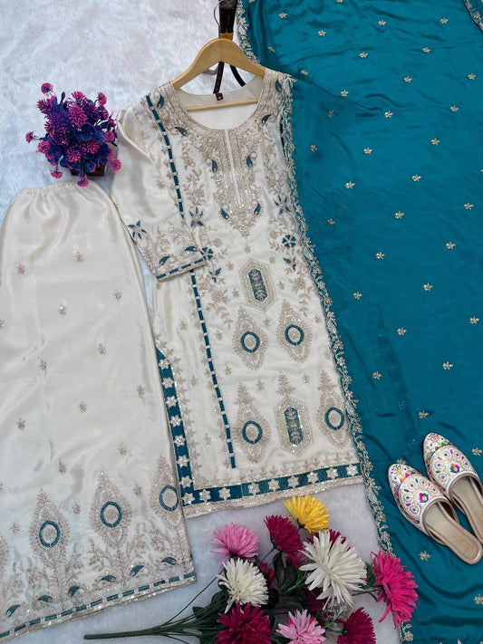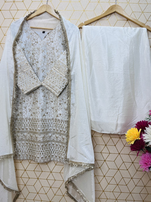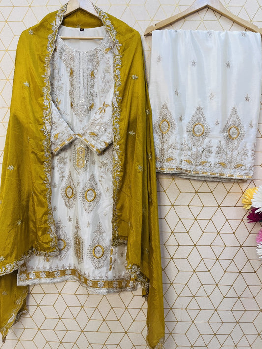 White Elegant Embroidered Chinon Silk Co-Ord Set with Dupatta