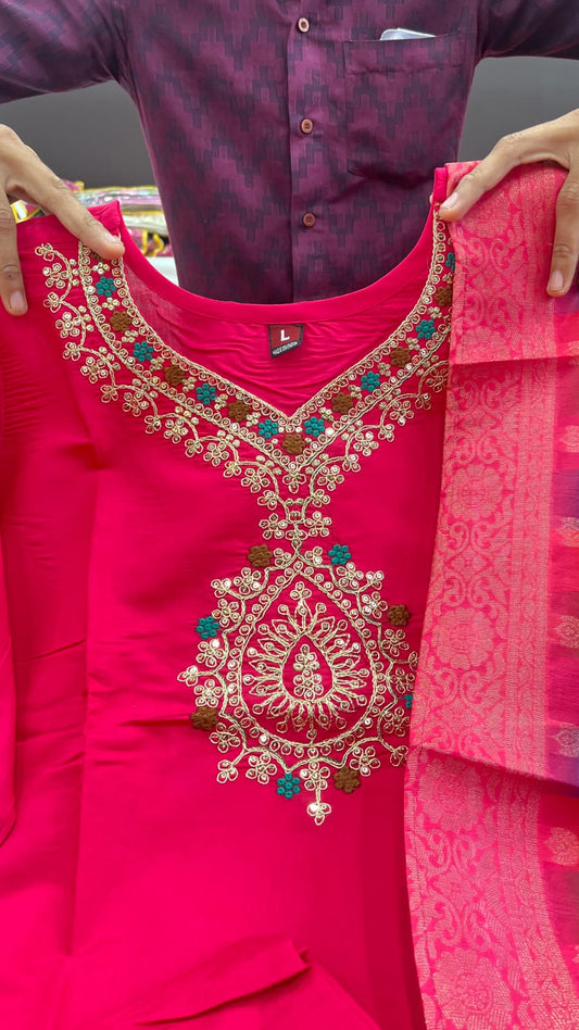 Pink Elegant Summer Floral Suit Set in Cotton Silk with Hand Embroidery & Schiffli Detailing