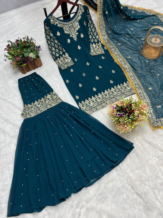 Luxe White & Dark Green Embroidered Faux Georgette 3-Piece Party Wear Kurti Set with Sharara and Dupatta – Ready to Wear