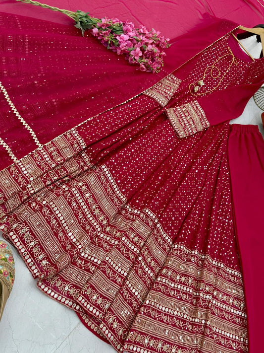 Red Elegant Pure Chinon Silk Top-Lehenga-Dupatta Set – Heavy 5mm Sequin Embroidery | Fully Stitched Party Wear Ensemble
