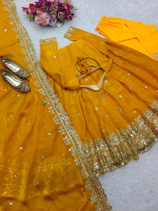 Mustard Yellow Regal Sequin Embroidered Chinon Silk Shalwar Suit Set