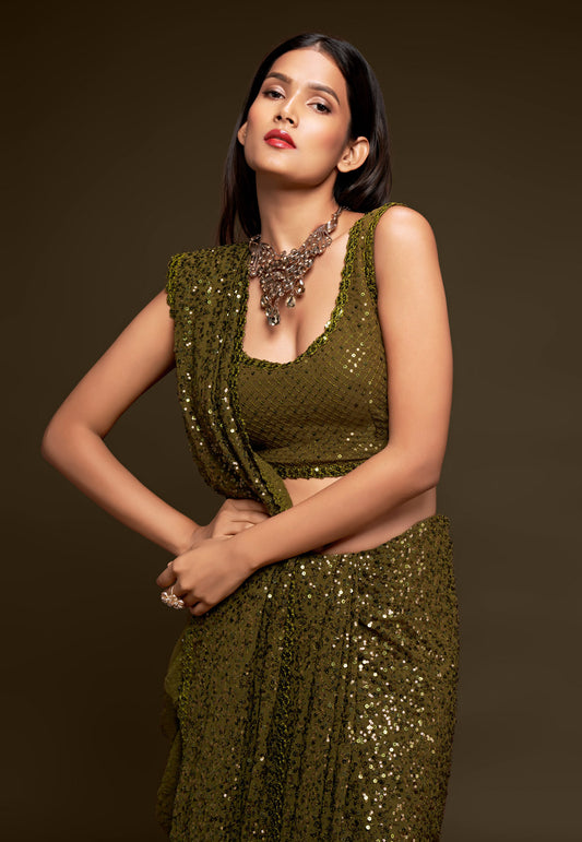 Mehendi Green Heavy Sequins Work Bridesmaid Saree with Blouse