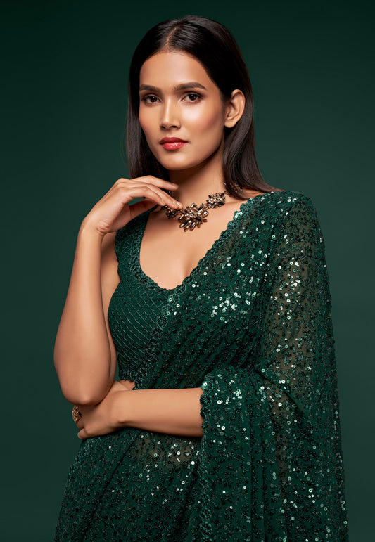 Dark Green Heavy Sequins Work Bridesmaid Saree with Blouse