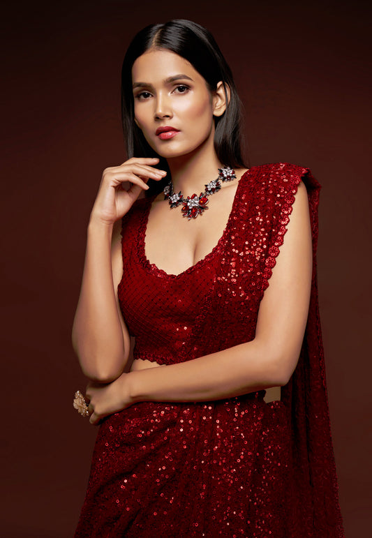Red Heavy Sequins Work Bridesmaid Saree with Blouse