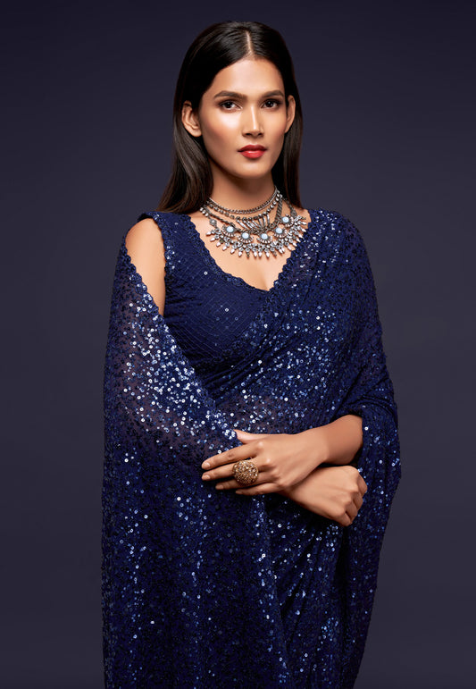 Navy Blue Heavy Sequins Work Bridesmaid Saree with Blouse
