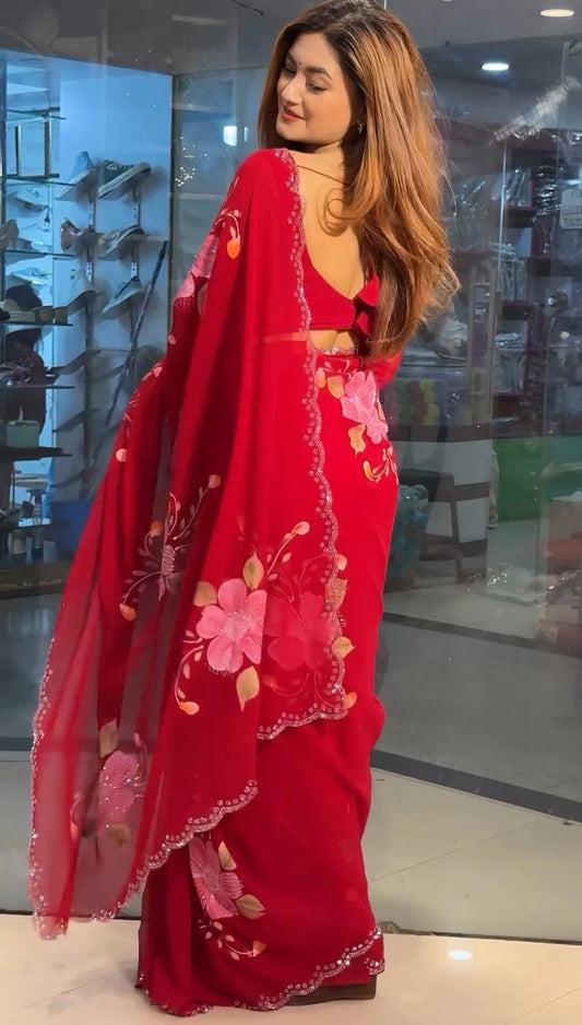 Radiant Red Party Wear Swarovski work Georgette Saree with Blouse Set