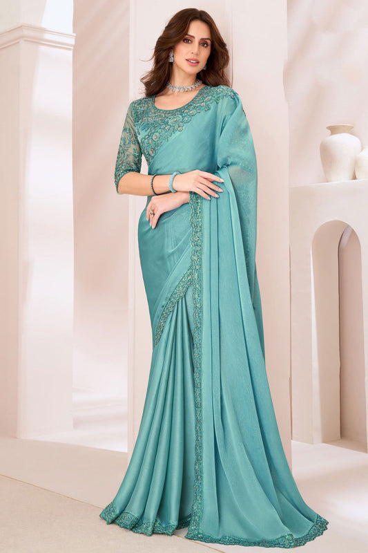 Sea Green Elegant Party Wear Georgette Saree with Embroidered Banglori Silk Blouse