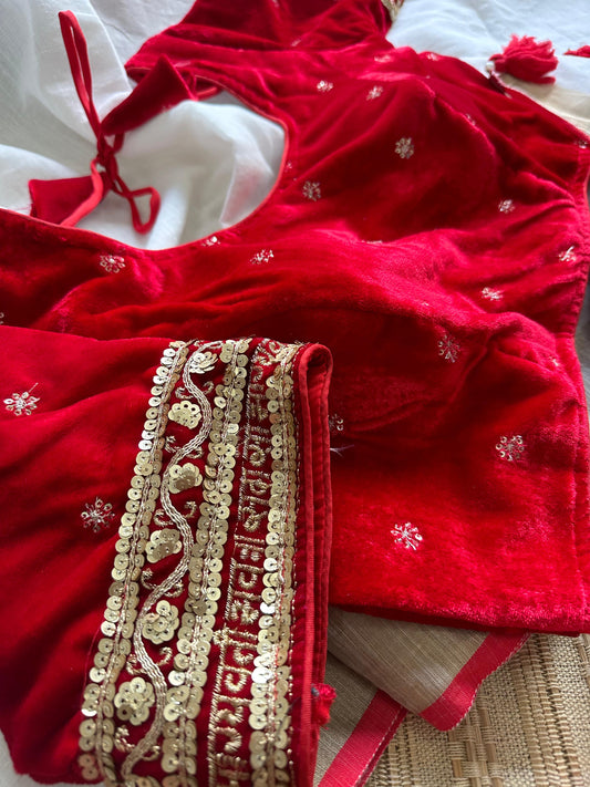 Durga Puja Special Red & White Khadi Linen Saree with Velvet Blouse with Petticoat