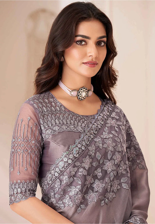 Dusty Purple Elegant Party Wear Chiffon Saree with Embroidered Banglori Silk Blouse
