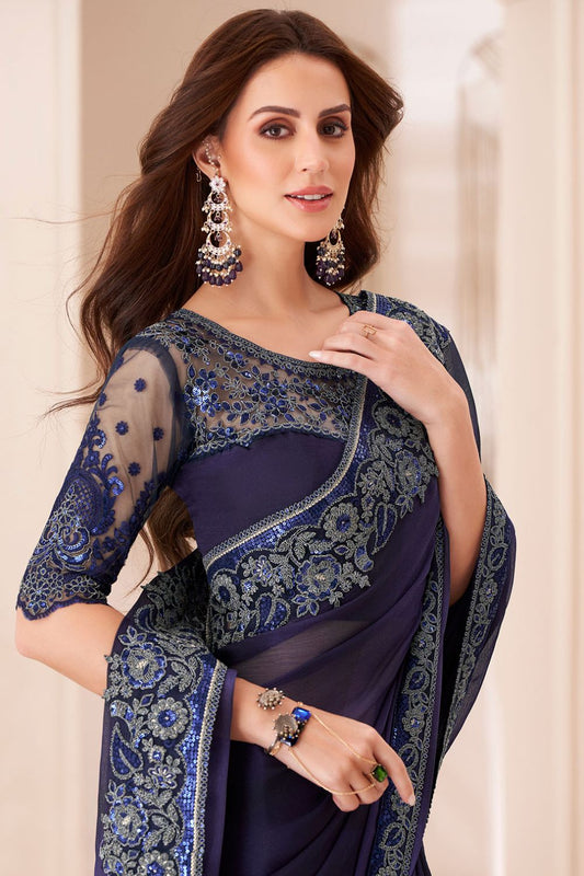 Midnight Blue Elegant Party Wear Chiffon Saree with Embroidered Banglori Silk Blouse