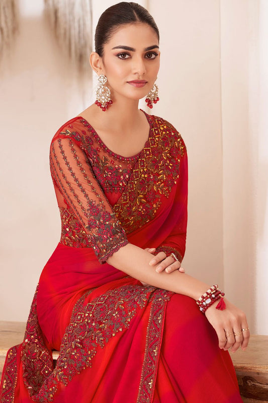 Red Elegant Party Wear Chiffon Saree with Embroidered Banglori Silk Blouse