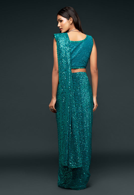 Teal Green Heavy Sequins Work Bridesmaid Saree with Blouse
