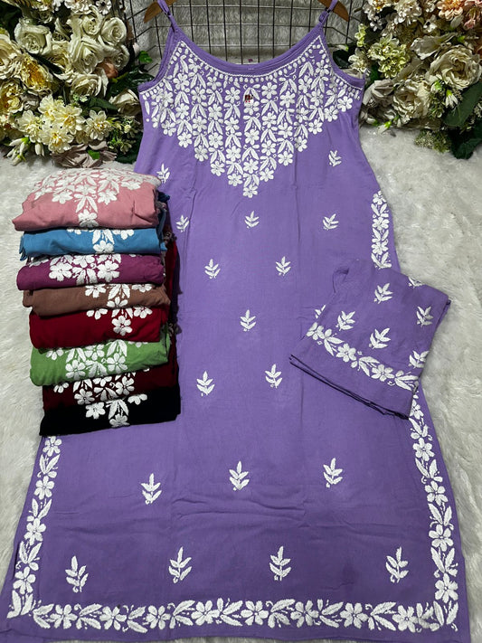 Purple Premium Noodle Strap Viscose Handwork Lucknow Chikankari Kurti