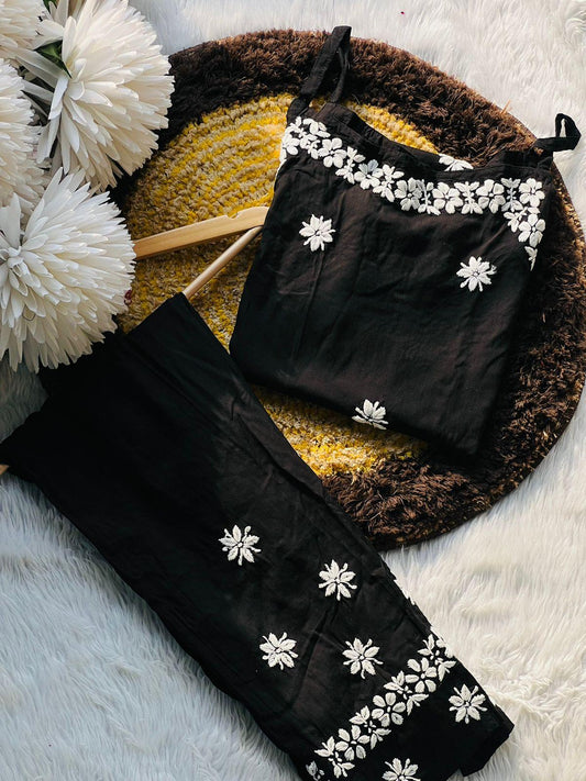 Black Lucknow Chikankari Strappy Kurti and Pant Co-ord Set (Limited Stock)