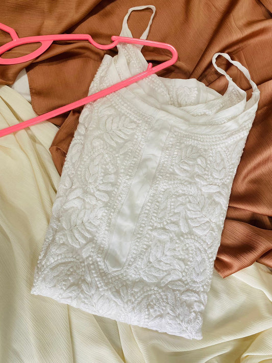 White Premium Noodle Strap Viscose Handwork Lucknow Chikankari Kurti