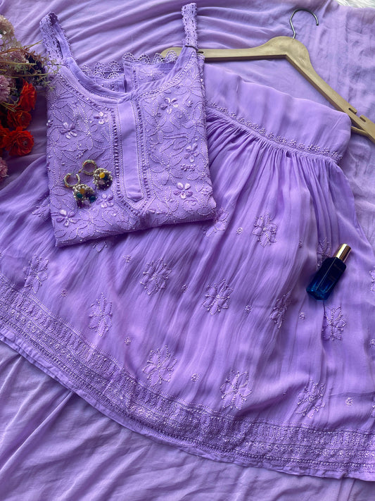 Lavendar Lucknow Chikankari Resham Work Viscose Short Kurti & Gharara Set with Chiffon Dupatta