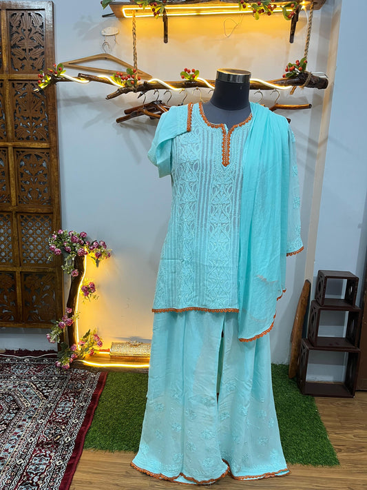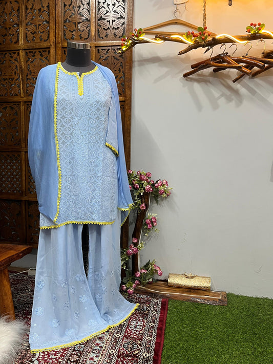 Blue Elegant Chikankari Kurta Sharara Set with Dupatta