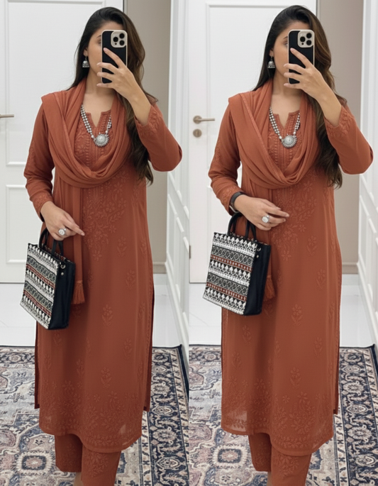 Terra Cotta Ethereal Dyeable Modal Chikankari Kurta Set (New)