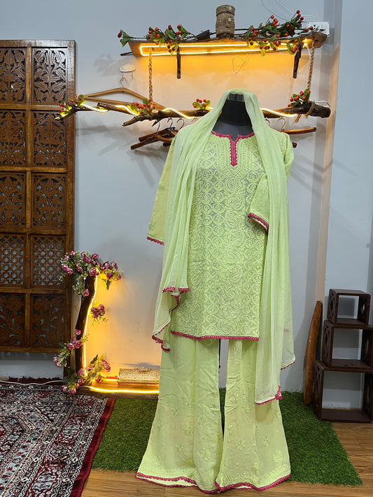 Dusty Green Elegant Chikankari Kurta Sharara Set with Dupatta