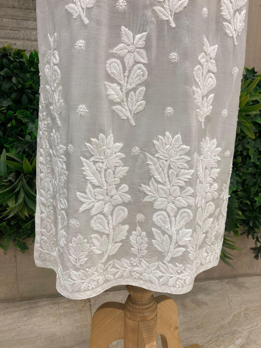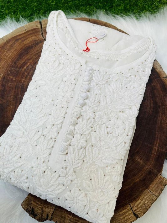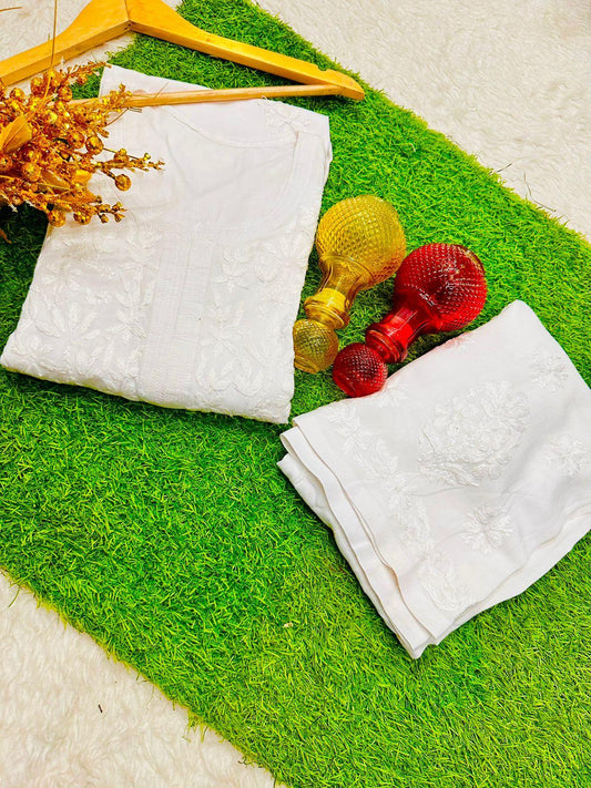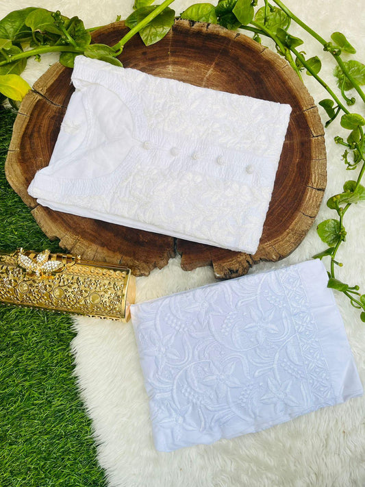 White Elegant Viscose Chikankari Work Kurti with 3D Fine Chikankari Handwork