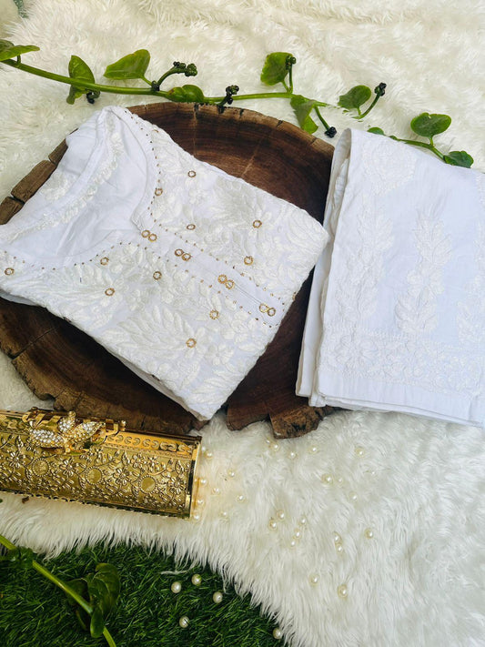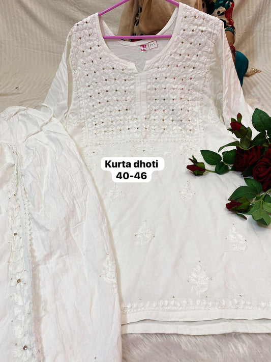 White Graceful Cotton Chikankari Work Set: Kurti + Pant up to 6 XL ++ Sizes