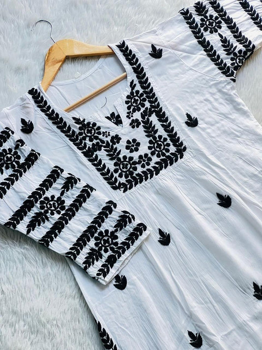 Monochrome Pure Muslin Chikankari Embroidery A-Line Naira Style Kurti with Lycra Pant