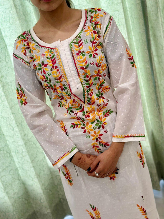 White Multicolor Chikankari Work Elegance Lucknowi Fusion Kurta Set