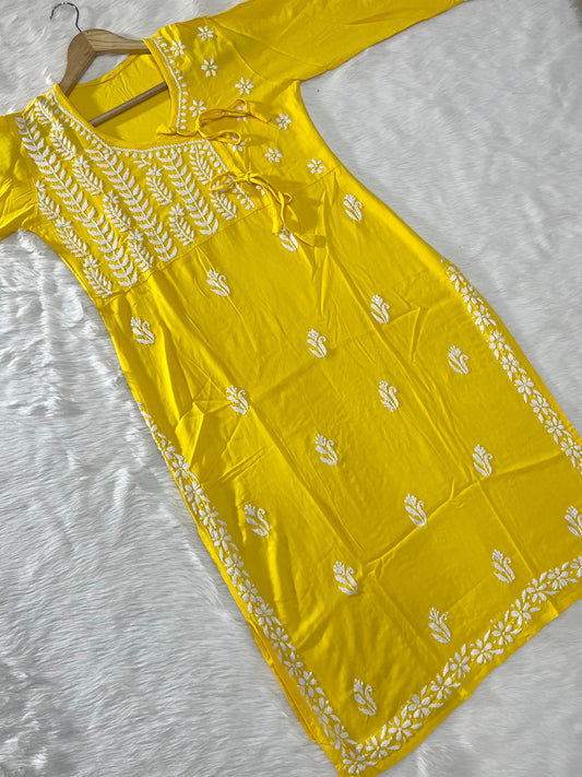 Yellow Premium Noodle Strap Viscose Handwork Lucknow Chikankari Kurti