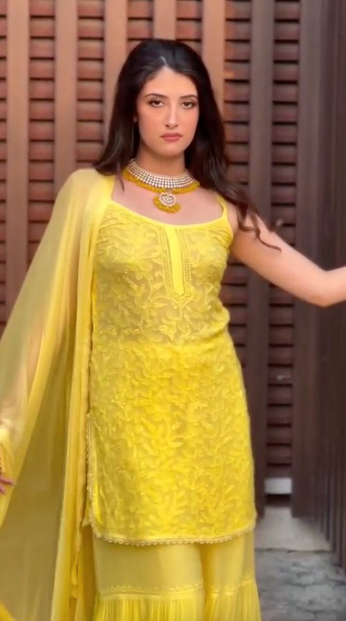 - Festive Celebrations: For Diwali, Eid, or a summer wedding, go for a viscose-georgette Anarkali or a kurta set with heavy Mukaish or Gota Patti work complementing the Chikankari. Pair with statement earrings and traditional juttis.