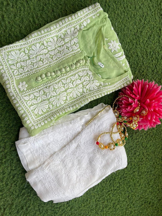 Green Premium Heavy Work Lucknow Chikankari Modal Kurti Palazzo Set for Summer
