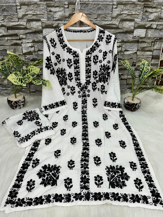 White Cotton Kurti Pallazo Set with Black Lucknow Chikankari Handwork