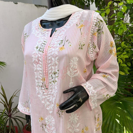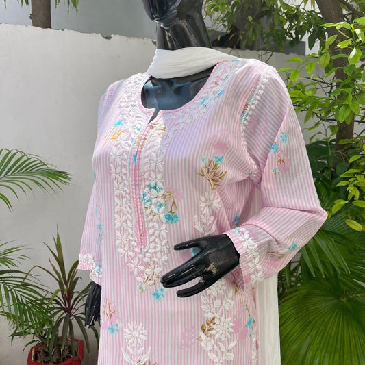 Light Pink Elegant Lucknowi Chikankari Cotton Kurti 3 pc Set