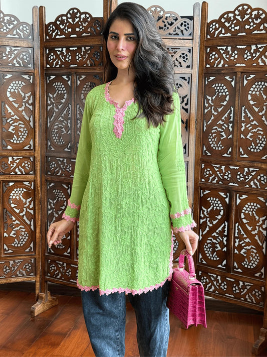 Light Green Resham Jaal Premium Viscose Chikankari Short Kurti Set
