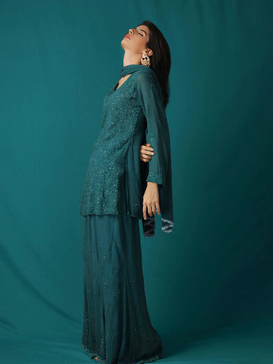Peacock Blue Zara-Zari Collection: NC Moss Silk Embroidered Kurti & Palazzo Set