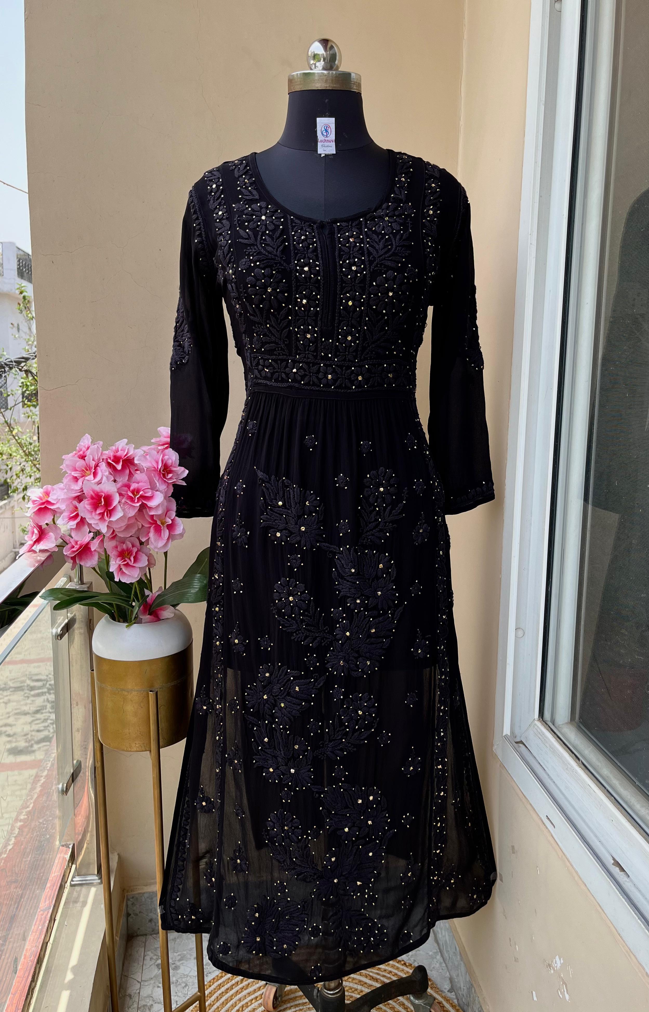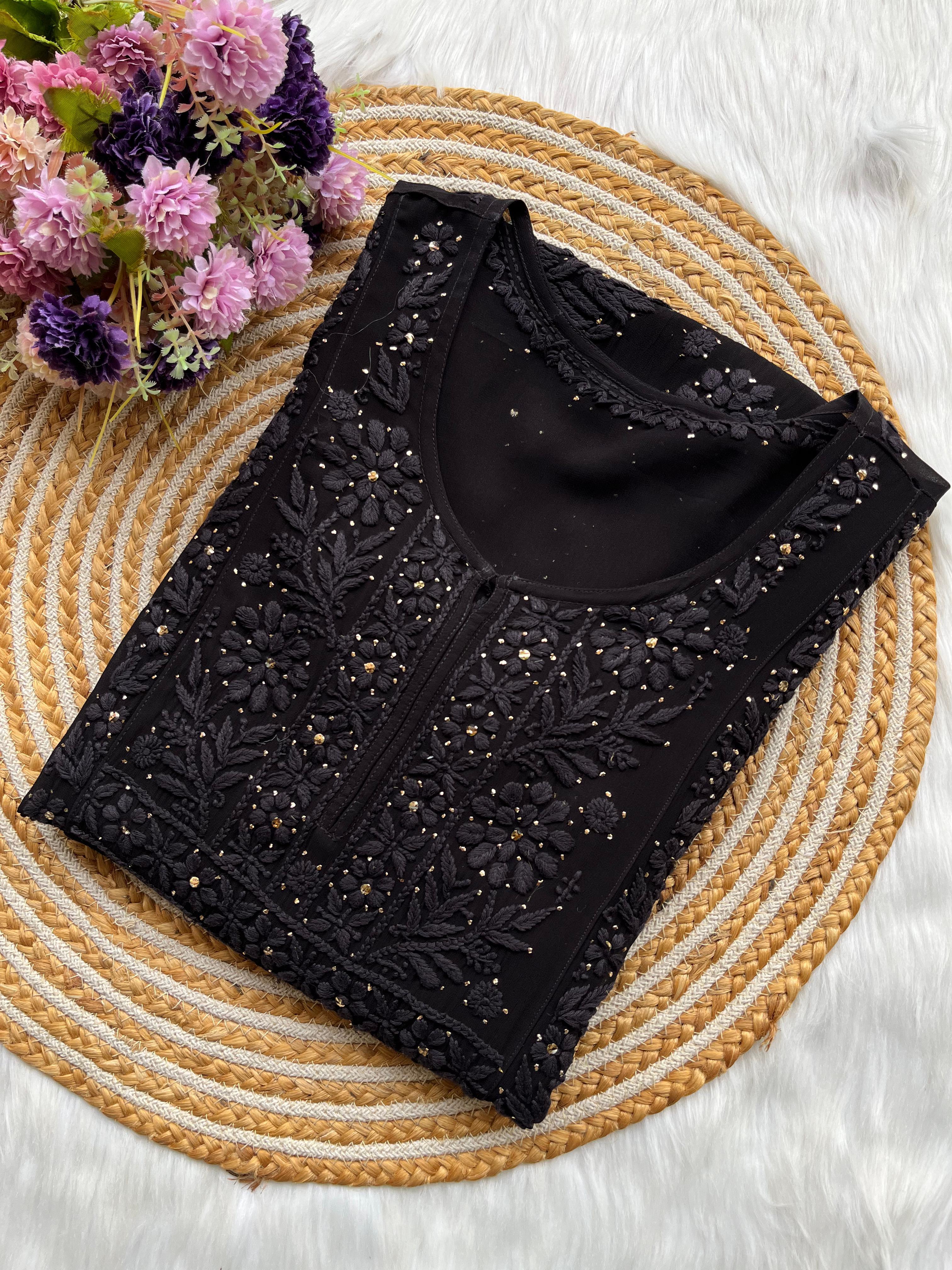 Black Premium Viscose Lucknow Chikankari Mukaish Hand Work Nyra Cut Kurti