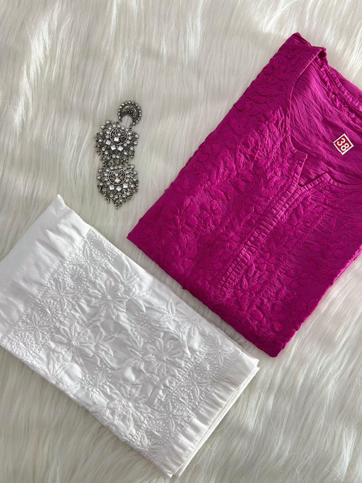 Dark Melon Pink Cotton Chikankari Hand Work Kurti Suits Online