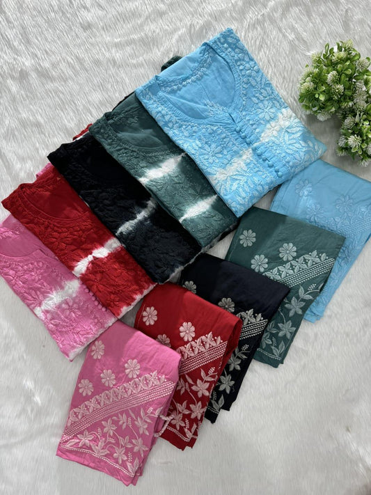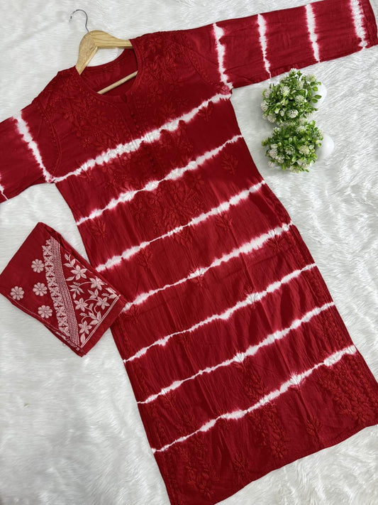 Maroon Tie n Dye Chikankari Cotton Set with Stretchable Lycra Machine Pant